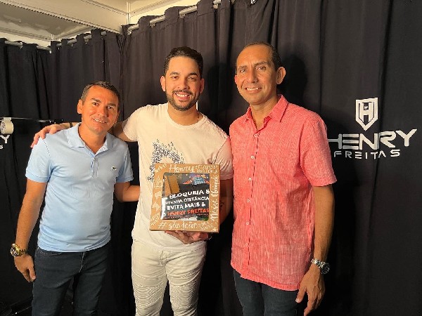 O prefeito Carlinhos junto ao vice-prefeito Júnior e o deputado Hermano Morais, receberam o artista.